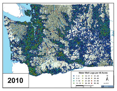Based on this exception, hundreds of thousands of so-called “permit-exempt” wells have been drilled around the state. The Department of Ecology documented the increasing number of wells between 1970 and 2010 in an eye-popping set of maps.